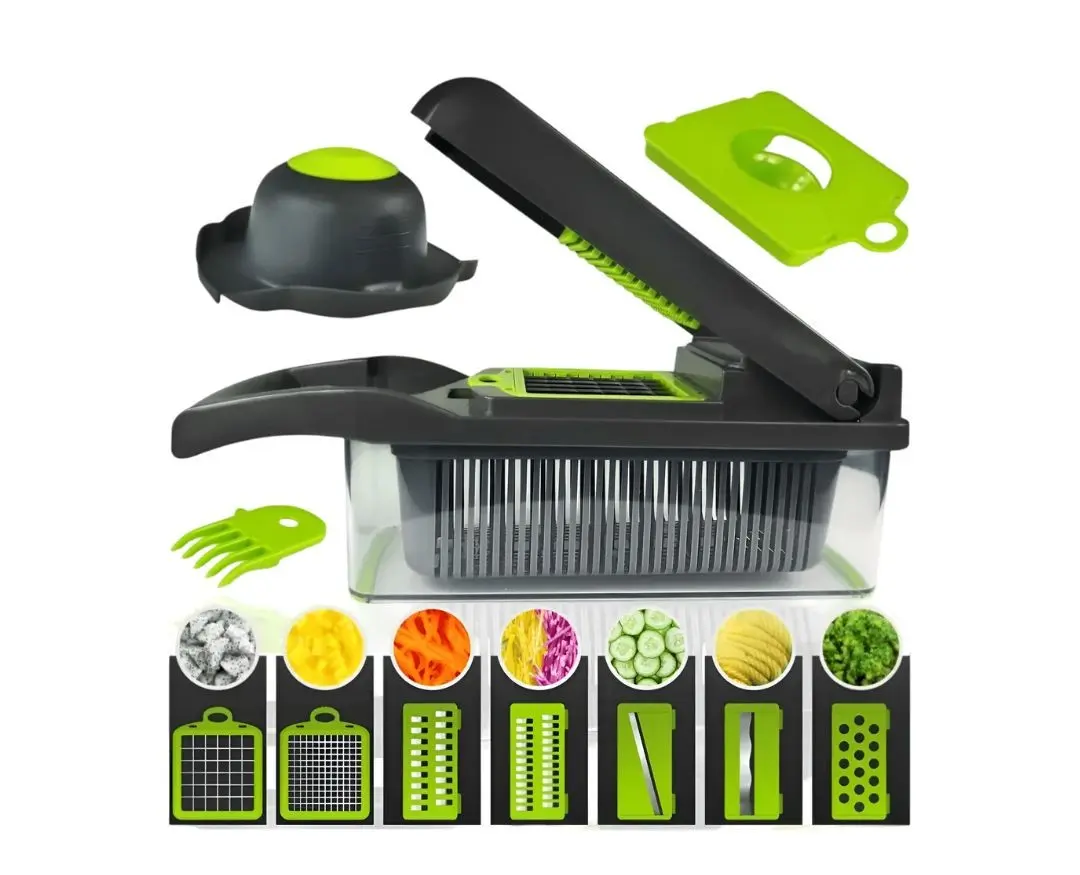Nuestro cortador de verduras y vegetales tiene (6) cuchillas diversificadas, que se pueden cortar en tiras, dados pequeños, trituraciones gruesas, trituraciones finas, rebanadas, flores cortadas y hongos. Es fácil de operar. Recorta nuevos trucos en la cocina.